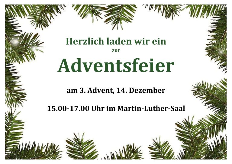 Die Adventszeit berührt uns immer wieder neu. Sie bringt vieles in uns zum Schwingen. Auch die Sehnsucht nach Gemeinschaft, zum Beispiel. Auch wenn so vieles los und jede Menge zu tun ist, eine stimmungsvolle Adventsfeier in dem einen oder anderen Kreis lassen wir uns nicht gerne entgehen. Unsere Adventsfeier ist offen für alle, die einen adventlichen Nachmittag in fröhlicher Gemeinschaft verbringen wollen – Gemeindeglieder jeden Alters aus unseren Dörfern sowie der Stadt Treuen.