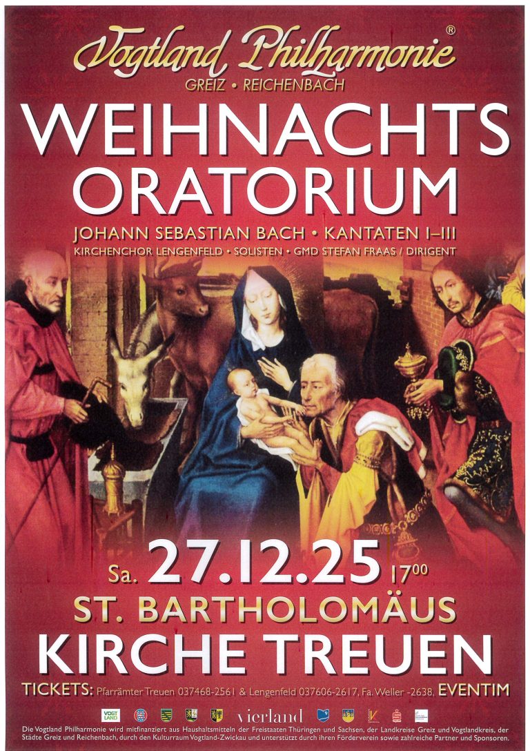 Das Weihnachtsoratorium von Johann Sebastian Bach wird seit vielen Jahren am 27. Dezember von der Vogtland Philharmonie unter Leitung von GMD Stefan Fraas, Solisten und dem Kirchenchor in Lengenfeld aufgeführt. Da die Heizung der Aegidiuskirche zurzeit defekt ist, sind wir dankbar, dass dieses traditionelle Konzert in diesem Jahr in der St. Bartholomäus-Kirche in Treuen aufgeführt werden kann.